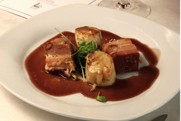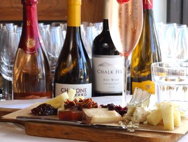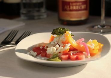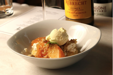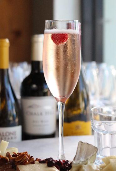 Our 7th Wine Dinner took place 2 days shy of the one year mark from our very first wine dinner we hosted here at City Market Bistro. Lots of new faces joined us for this one and we couldn't be happier to so many first timers! Our friend Kim Braddock took the lead in walking our guests through each glass of wine that she helped Chef Scott pair with all 4 courses. When our guests arrived they were greeted with a glass of Brut that had a splash of Gentian Amaro and floating raspberry. Their tables had family style cheese boards with Tellegio, Corcofi Tartufo, Petite Basque Sheep Cheese, Humbodlt Fog Goat Cheese, Cave Aged Blue, candied nuts and Membrillo Jam to enjoy with their opening beverage. Not only was it National Culinarians Day, it was also National Wine and Cheese Day so we felt it was an appropriate start to the evening. Our first course consisted of Fresh Watermelon, Heirloom Tomatoes, Feta with Champagne Vinaigrette. Kim's suggested pairing was a French Rose Brut known as Cremant D'Alsace by Lucien Albrecht, a bright strawberry flavored wine with richness and dense flavors. Next up was an "Arts and Crab" combination, Chef prepared Grilled Artichokes with a light lump crab salad and a Meyer Lemon Emulsion. Chalone Vineyards Chardonnay was the sidekick to this dish and it lent it's golden hue of goodness with opening notes of lemon curd, mandarin orange and hints of toasted brioche. It's elegant finish lifted from it's wet rock minerality. As we entered the third course guests were poured the only red wine of the night, Chalk Hill Red Wine Blend. Bold, mostly dry, and aged in French and American Oak. Cherries, mocha and vanilla filled the nose, while cherry and spices hinted on the palate. Chef Scott made a Diver Scallop & Seared Pork Belly plate with Caramelized Shallots and Bordelaise Sauce. The pairing was exquisite! But than it was time for the grand finale, a Roasted Peach Tart w/ Strudel topping and a Creme Fraiche Sorbet was placed in front of each of our guests with a glass of Gewurztraminer Reserve, a French white with tropical notes of Lychee and Pineapple. What a hit!!