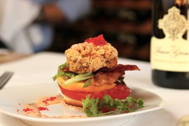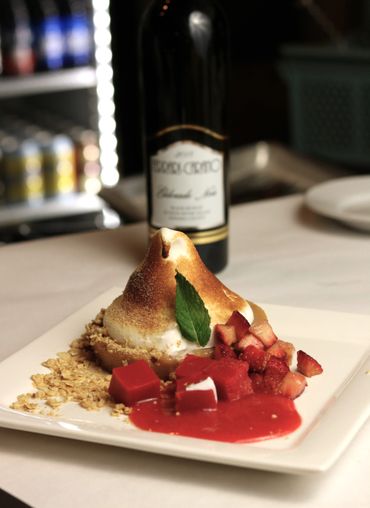 Our opening wine was a Brut from California called Banshee Ten of Cups and was paired with an amusee made up of Cucumbers, Radishes, Lump Crab, drizzled with a Lime/Mint Vinaigrette and a bit of Lemon Zest to top off. The next pour was of a Pinot Blanc named Four Graces that was paired with a Crispy Oyster BLT composed of Heirloom Tomatoes, Apple Smoked Bacon, Curly Endive, Fried Oyster atop a circular Brioche toast with Tobiko Caviar. Down to earth with a dash of fancy! Ferrari Carano's Pinot Noir followed up with a Grilled Asparagus Salad that shared the plate with Prosciutto, Fire Roasted Peppers, Shaved Parmesan, a Soft Egg and Truffle Vinaigrette. This duo was an incredible experience of explosive flavors, each sip lead you to a different conclusion to the one you had previously thought you had already pinpointed, each being just as satisfactory as the last. The third course was a Pan Roasted Halibut with Quinoa, Romano Artichokes, Olives, Wilted Baby Kale, Sundried Tomatoes and a Basil Emulsion. To support this heavy hitter, Kim paired it with a Red Blend from Roth Estate "Heritage" from Sonoma County it's bold tannins and decadent flavors of dark berries and toasted oak complimented the Halibut exquisitely! And finally for the finale El Dorado Noir, another potion by Ferrari Carano, was paired with Chef Scott's Strawberry Mascarpone Tart. The Swiss Meringue with Roasted Strawberries and Strawberry Balsamic Puree was the icing on the evening!